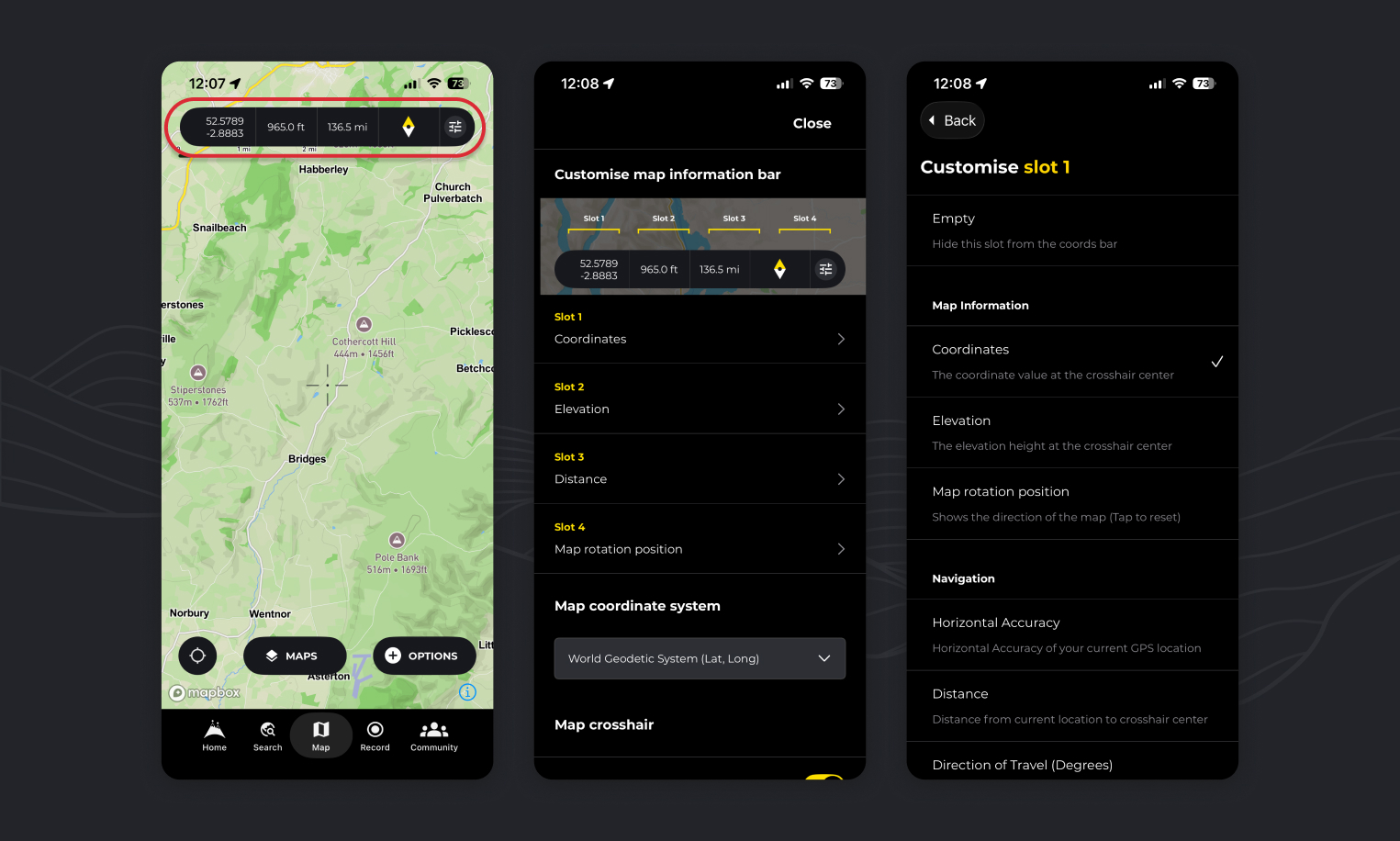 The map information bar features handy live data corresponding to your location and the map center crosshair such as coordinates, bearing, weather info and more.