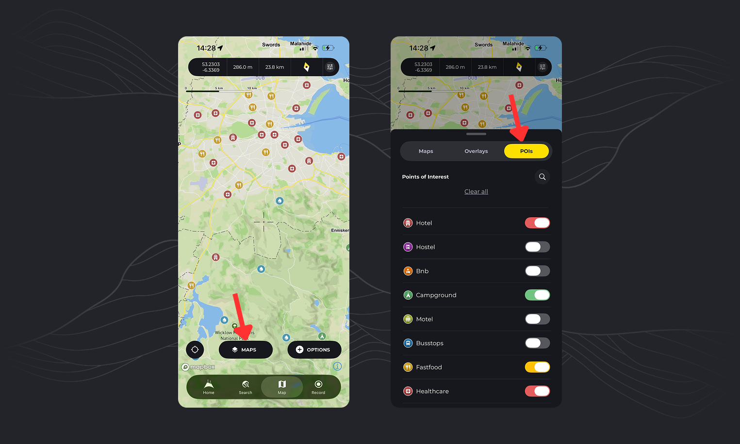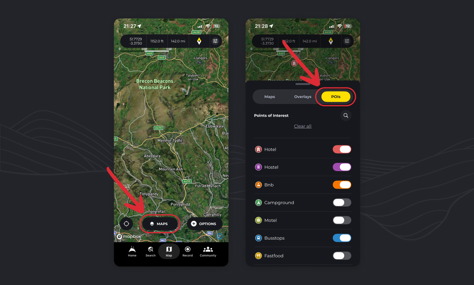 - Tap the “Maps” button and then tap on the “POIs” tab for a full list of available categories.