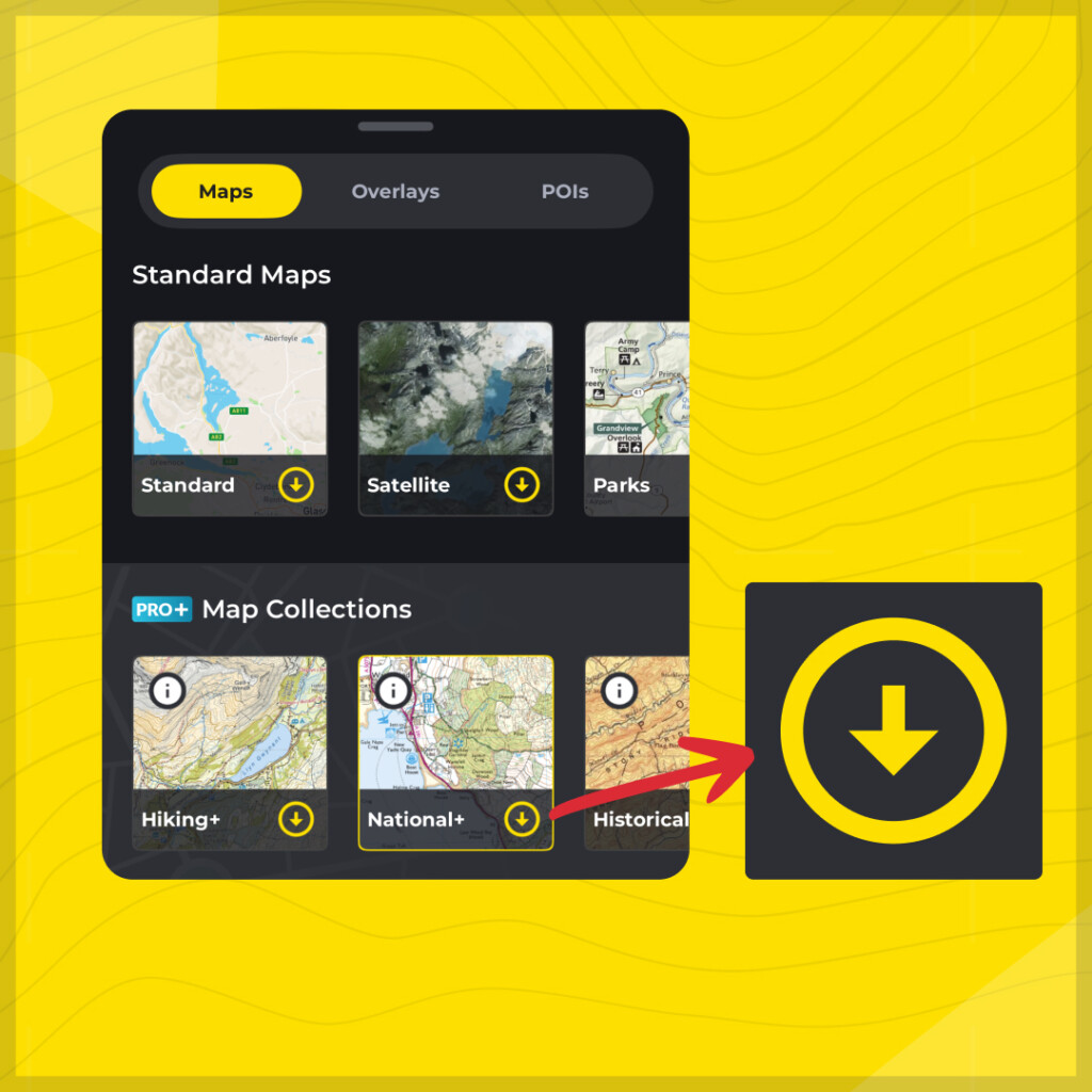 We have made downloading map really easy too! From any of the map pages, access the “maps” option. On each of the map options you will see the yellow download icon. Tap this icon to start the download.