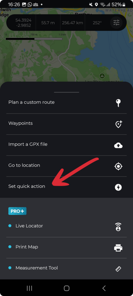 On any HiiKER map page, tap on the “Options” button, then select the “Set Quick action” option.
