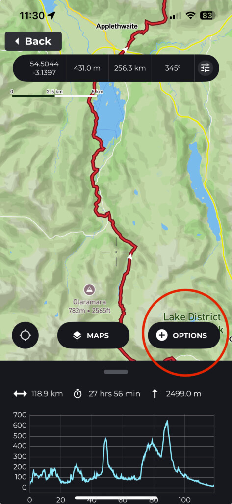 To find the measurement tool, Go to the map of the trail you wish to measure a section of and tap the “OPTIONS” button in the bottom right. This will open our action menu where you can complete various tasks on the map.